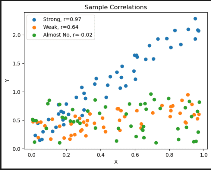 We use Python to examine 3 data sets in the following example diagram. We calculate the correlation coefficientsnumpy.corrcoefand plot the data points usingmatplotlib.pyplot.scatter. We can see the strong and weak correlations.