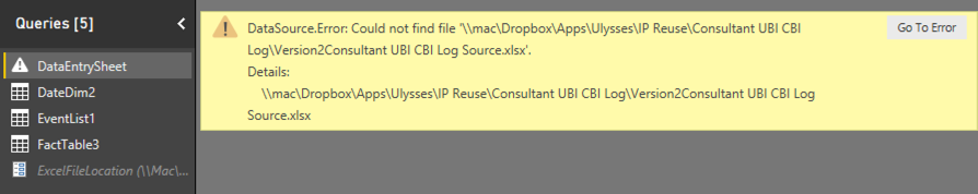 Hitting Save will record your changes. If all is good, you should not see any Triangles indicating a query error, as shown in the image below. I removed the last slash from the file location to produce this error. If you do make a mistake, re-edit the query. Your error will disappear once a correct value is entered, and the table icon will return.