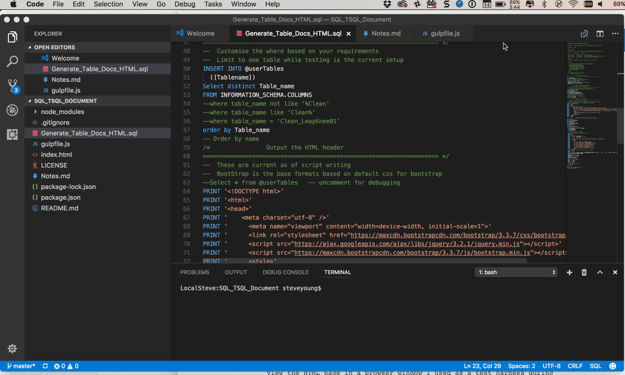 The code, having HTML in the TSQL, would not display, so I have included a link to the SQL File here. A picture of the VSCode project is shown below.
