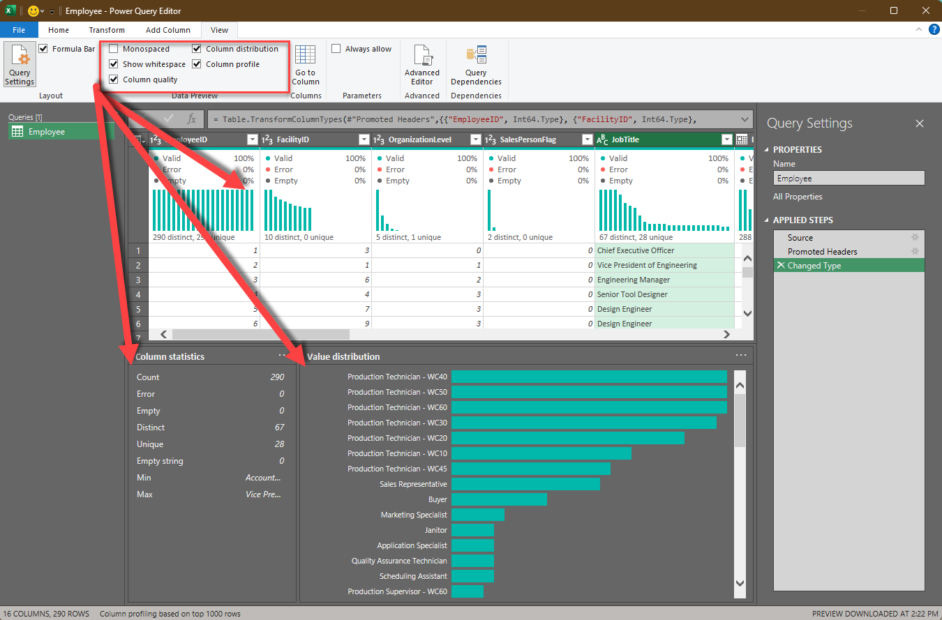 Excel includes Power Query, which provides an end-to-end data workflow from acquisition through manipulation and preparation. With no effort, you can visualize basic profiling information of the data you are importing using the data profiling tools pictured below.