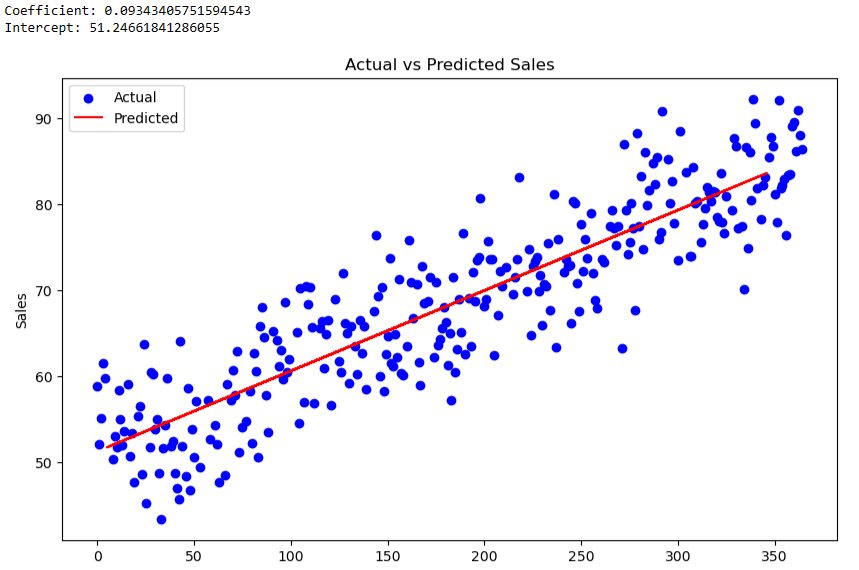 A scatter plot of the actual sales and a line plot of the predicted sales. The blue dots represent the actual sales data, and the red line represents the expected sales. The goal is to make the red line as close to the blue dots.